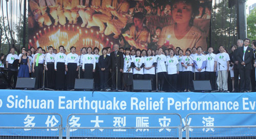 5月31日,由加拿大四川地震赈灾委员会主办、多个华人社团协办的“生死不离──多伦多大型赈灾义演”在多伦多市政府门前的菲腊广场圆满举行,演出历时近4个小时,吸引千余人到场。多伦多总领馆朱桃英总领事夫妇、加拿大联邦多元文化部长康尼(Jason Kenney)、安省移民厅长陈国治、国会议员詹嘉礼、邹至蕙、侨领伍卓生、陈丙丁等出席并讲话。