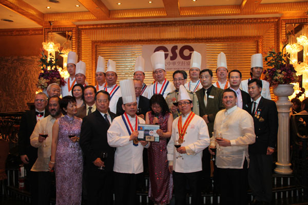 当晚的菜式全部採用了传统的菜式,但製作上却採用了新派的做法,好像第一道的冷盘菜就是中西合璧,用沙律配乳猪,让人口感乳猪的爽脆的同时又能感到沙律的清爽,不会让人觉得油腻;还有太极海皇羹,卖相出品相当的美,犹如一幅彩图,让人胃口顿开; 美极牛柳粒也是一道好吃的停不住手的好菜,牛柳的鲜嫩感全出来了,让好多的宾客都提出了相同的问题:为什麽这牛肉可以做得这麽的嫩?这当然是我们的厨艺大师级的人马才能有这样的作品。整台晚宴让人陶醉在音乐与美食当中,充分体验了“名人饭局 美酒佳餚 厨艺展示 优雅乐章”的主题;当晚除了美食之外,重头戏就在于“盛装晚宴 分享荣耀”, 大会安排了国会议员梁中心先生给首批创会会员颁发荣誉奖章,受奖的人员有: 梁 文,箫 辉,张顺德,杨培基,梁明,杨 松,梁文仲,蔡洪,Gordon Lee,曾宪威,谭晓刚; 海军准上将颁发荣誉奖牌给我们的赞助商: 名门饮食集团; 龙腾金阁饮食集团; 天皇明粥; 李锦记集团,名楼饮食集团;万锦市市长给第二批地创会会员颁发了第二批的创会会员的荣誉奖章,他们是: 孙正纬,康冬梅,粱国钊,Daniel Chan, Eddie,Kevin。