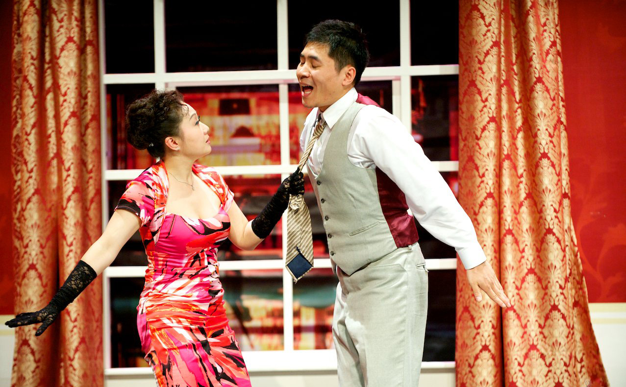 伴随着优美的音乐,暗红色的大幕缓缓拉开,首先跳入我眼睛的是令人过目难忘的布景,真是太逼真,太专业了。深红带暗花的墙壁,视野开阔的大扇窗,典雅的白色壁橱和大门,沙发,台灯,盆花无一不像是个高级宾馆的套间。衣着光鲜的男女主角随着音乐柔情蜜意地翩翩起舞,一场由偷情约会而引起的闹剧也随之展开。