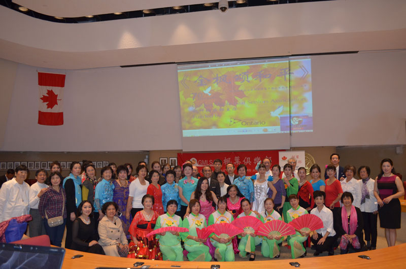 【来稿】10月3日上午,秋风瑟瑟,气温骤降,但在士嘉堡市政厅里却是灯火通明,热闹非凡。庄严的议会厅正中,《金枫颂和平》的主题屏幕格外引人注目。200多名各界人士齐聚一堂,参加由金枫老年协会主办的纪念反法西斯战争暨中国抗日战争胜利七十周年文艺表演活动。