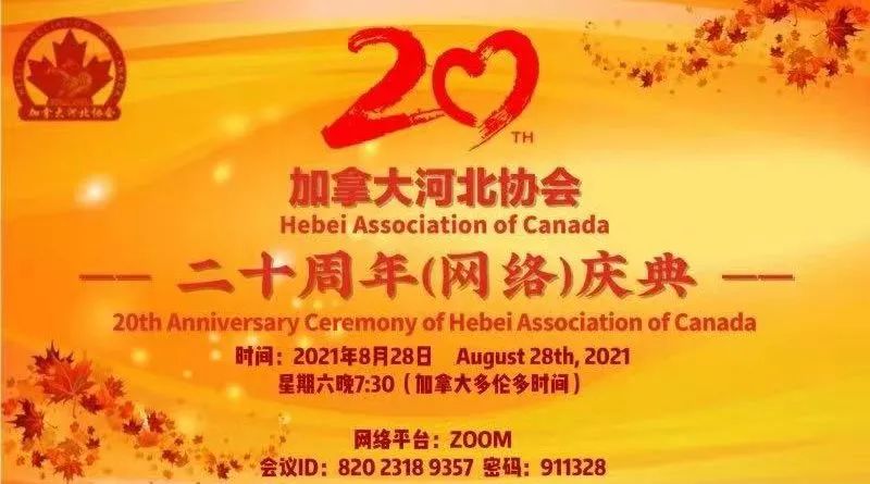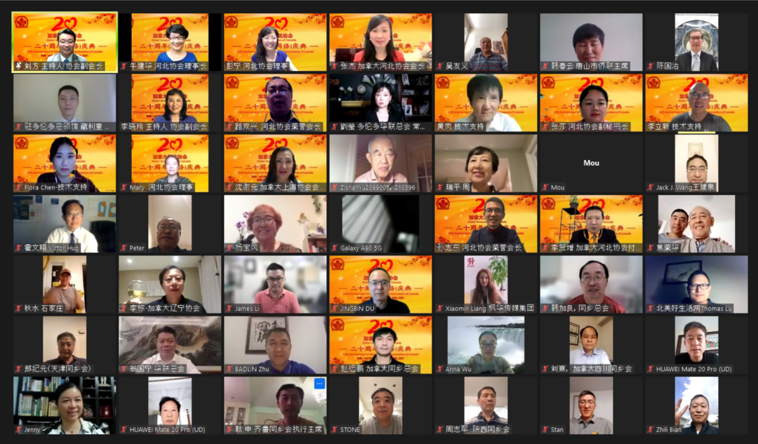 加拿大河北协会成立二十周年(网络)庆典于加拿大多伦多当地时间2021年8月28日晚成功举办。在全球新冠疫情依旧严峻的形式下,庆典采用ZOOM平台进行直播,来自加拿大、中国、美国、澳大利亚、新西兰等多地百余人参与、观看了直播。整场庆典在欢乐吉祥、喜气洋洋的氛围中为河北乡亲奉上了一场情意浓厚、祝福满满的文化盛宴。