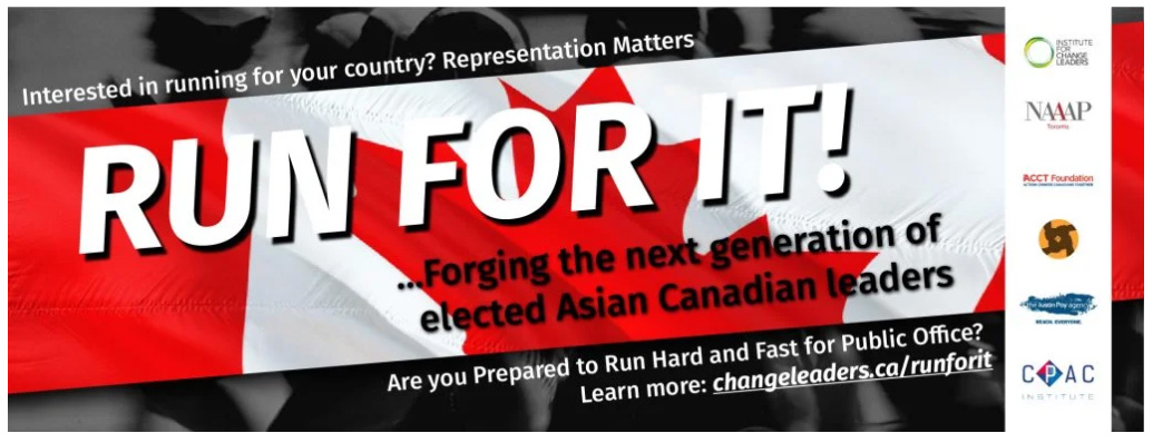 Run for It! 是一项无党派培训和辅导计划,致力于支持包括加拿大华裔和原住民在内的东南亚族裔人士参与加拿大各级公职选举,成功进入联邦、省、市议会和地方教育局。