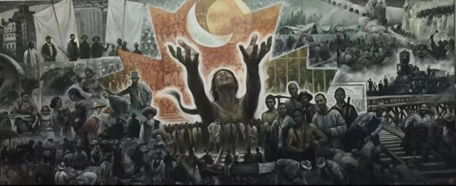 在这幅长350厘米、宽150厘米的画面中央,是一个浓缩的华人的形象,有力向前伸出的双手,表情凝重而虔诚,他的“吶喊”象征华工的的奋斗、挣扎、虔诚与无奈。