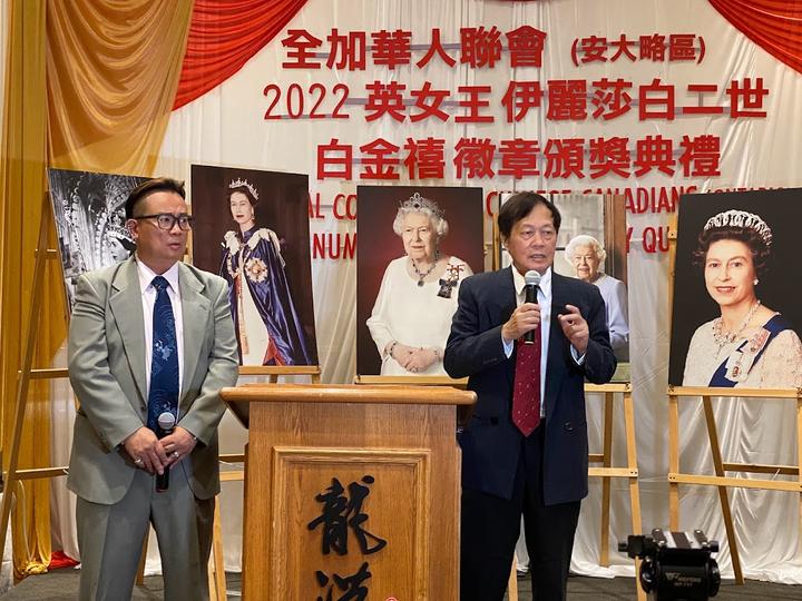 纪念英女王伊丽莎白二世陛下登基 70 周年,全加华人联会(安大略区)7月18日晚在多伦多列治文山市举办2022年英女王伊丽莎白二世陛下白金禧徽章颁奖典礼,联邦国会议员马万里(Majid Jowhari)出席并给获奖人员颁奖女王伊丽莎白二世陛下白金禧徽章和证书。全加华人联会(安大略区)获联邦政府批准,向钟新生、李景辉、沈谢元、林豪蔚、叶国良、梁梅英、陈雪珍、赵劲忠、黄金趸等 20 人颁发纪念英女皇登基 70 周年白金禧徽章,以表彰他们对社区的贡献。