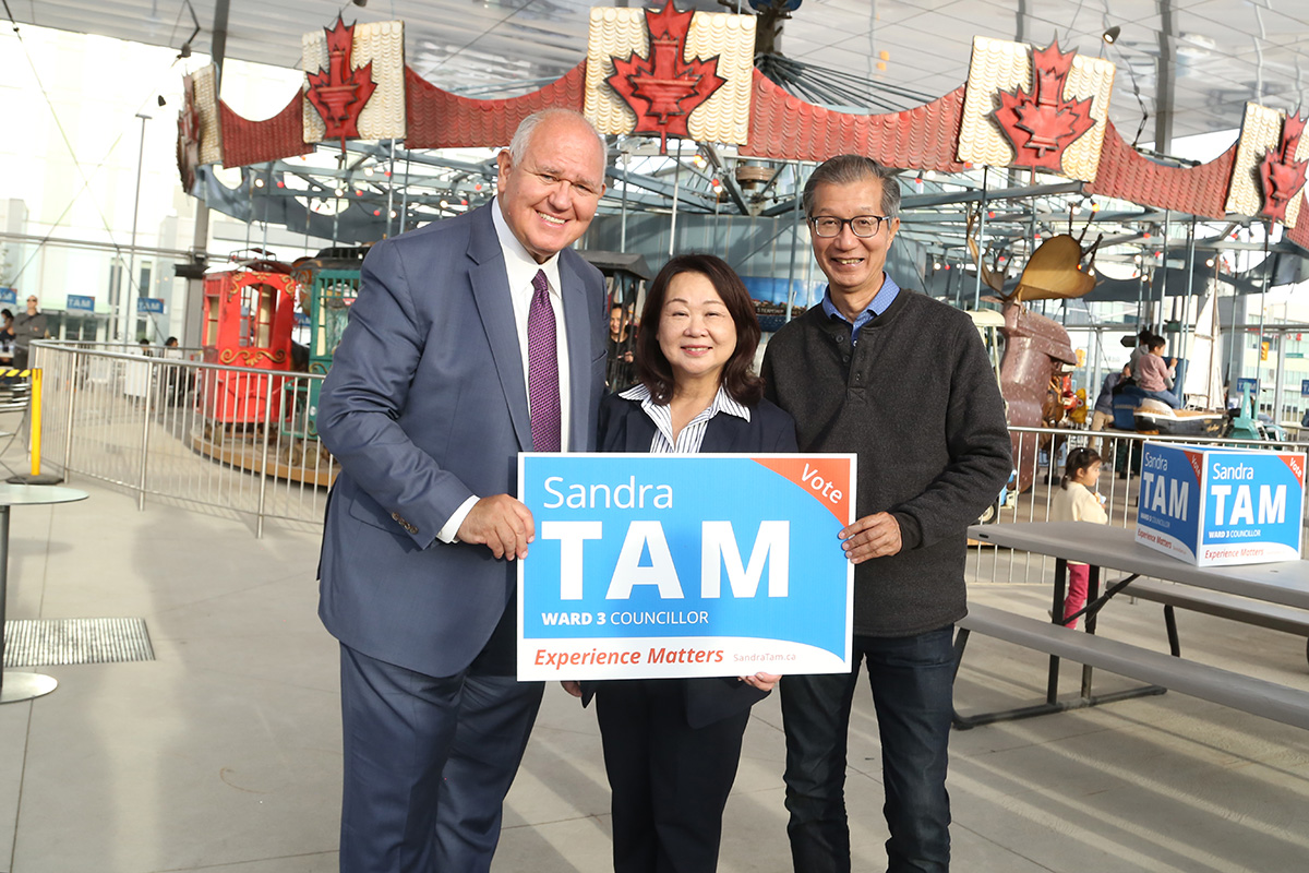 参选万锦市第三区市议员候选人谭贵琼(Sandra Tam)於10月1日(星期六)下午五时至七时在Markham Centre 的旋转木马玻璃屋内,举办一个与居民见面的活动,百余位支持者参加。出席的除陈国治外,万锦市市长薛家平特别出席并为她造势、推嵩谭贵琼(Sandra Tam)是一位被认可的社区领袖。