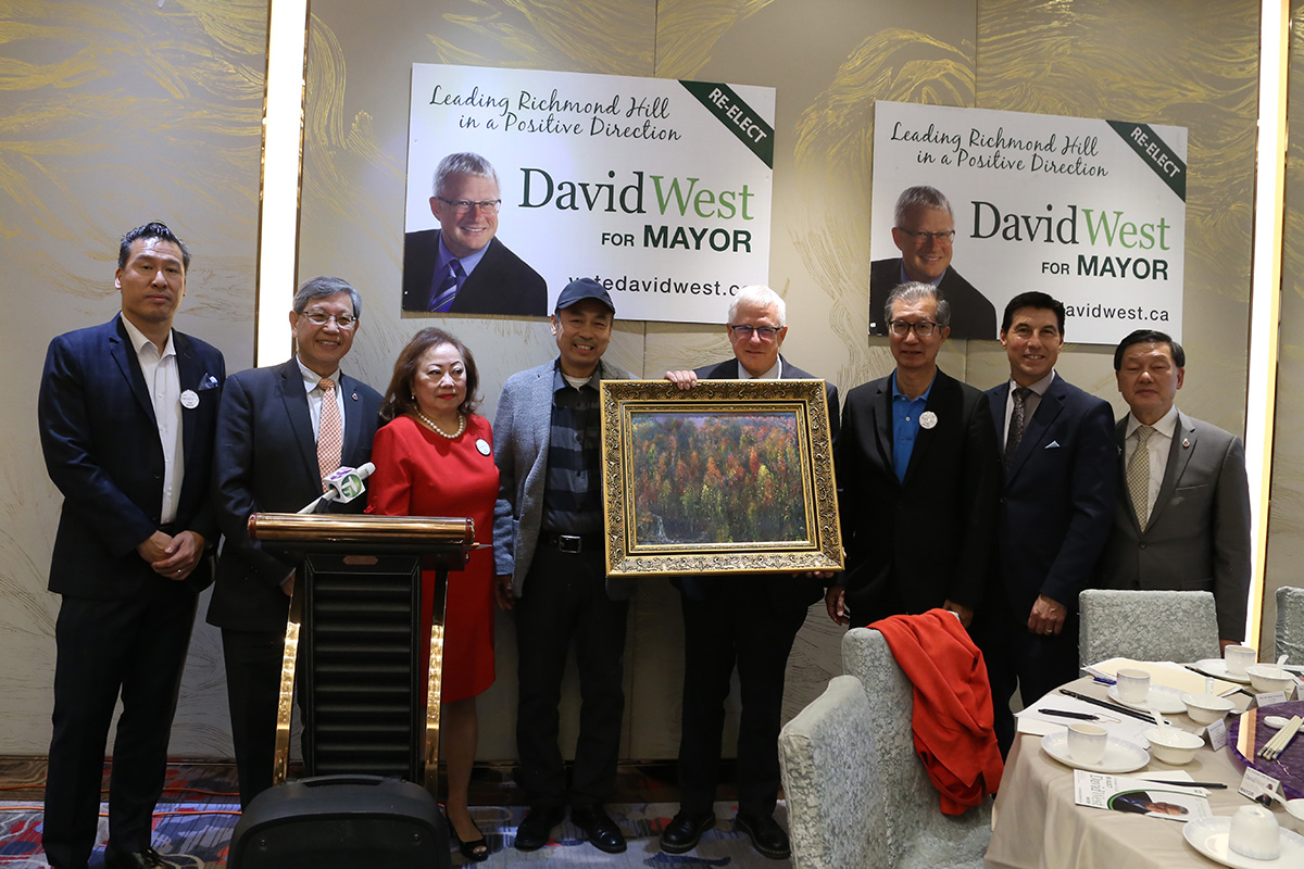 活动主持简惠儿是商界成功女性,她经营广告公司超过30年,一直致力服务社区,获奖无数。她表示,大卫的爱心和亲民会为他成功连任加分。本地画家左晋,专程赠送了他的一副油画小枫彩,祝市长竞选连任成功!在座谈会上大家还了解到,大卫是一名专业摄影师!他还连续多年在烈治文山市推广Monarch 蝴蝶活动,为环保积极发声。