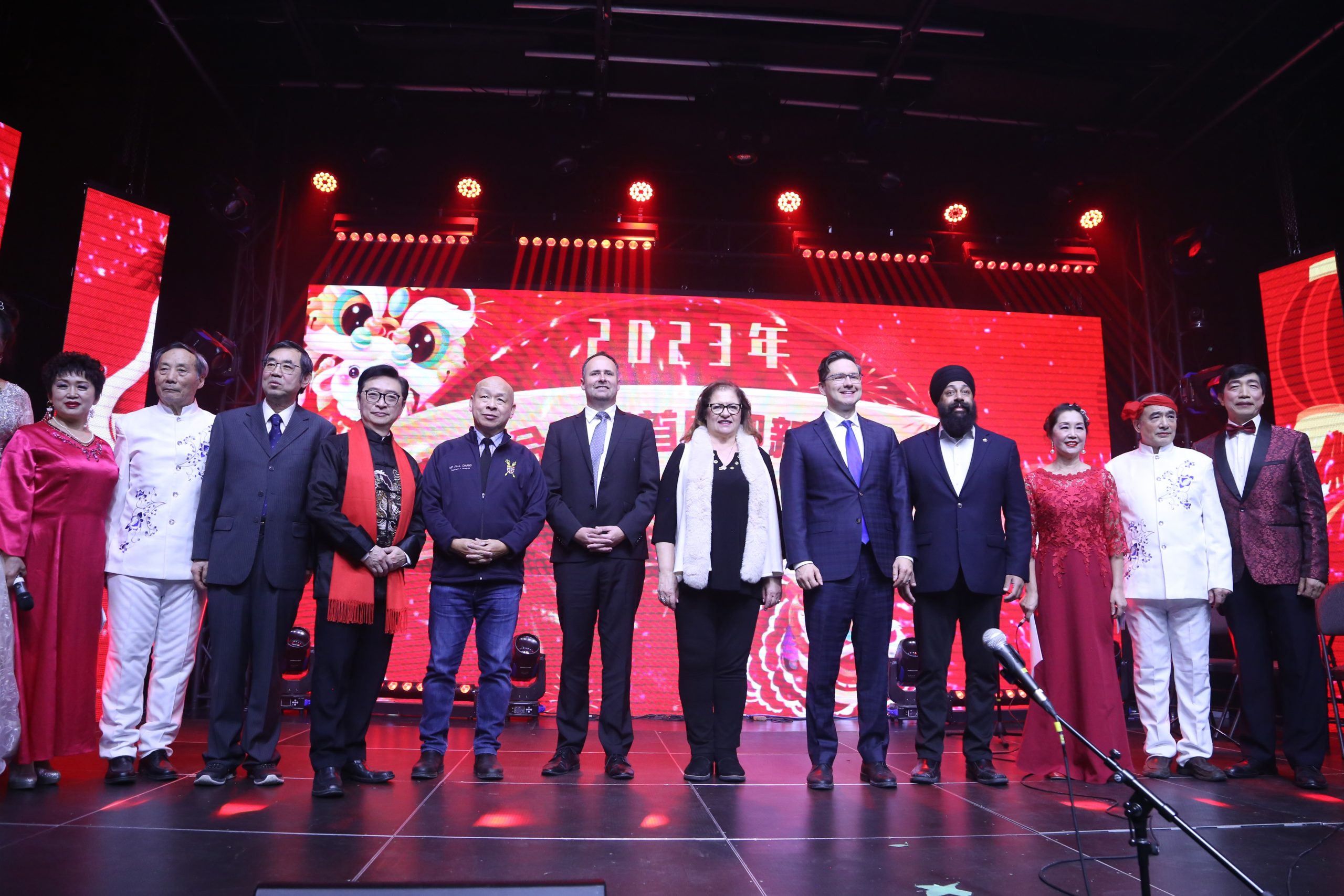 出席新华会这台华人演唱会的嘉宾有:联邦保守党党魁 Pierre Poilievre 博励治和保守党的Philip Lawrence罗伦斯(议会税务评论员) Anna Roberts罗勃茨,Jasraj Hallan 哈兰(议会财务评论员)及自由党Paul Chiang蒋振宇(多元文化部长议会秘书)等五名联邦国会议员,还有省议员彭锦威,约克区议员何胡景,十余个不同族裔的社团负责人。联邦保守党魁及三位国会重量级人物共五位联邦国会议员同时参加华人社区活动实属罕见,嘉宾规格之高、人数之多,彰显三级议员和政府官员对华人社区和中华文化的关注,对华人(特别是老年华人)的关怀,对加拿大新华人联合会的支持。尤其是保守党党魁 Pierre Poilievre 博勵治登上舞台,发表热情洋溢的讲话,用华语祝福华人“新年好”,让新华会的老人们非常感动,报以阵阵热烈的掌声!各位议员也先后登台讲话,並同新华会杨海峰会长和新华合唱团分会张万起会长及其他华人社团负责人拍照留影。