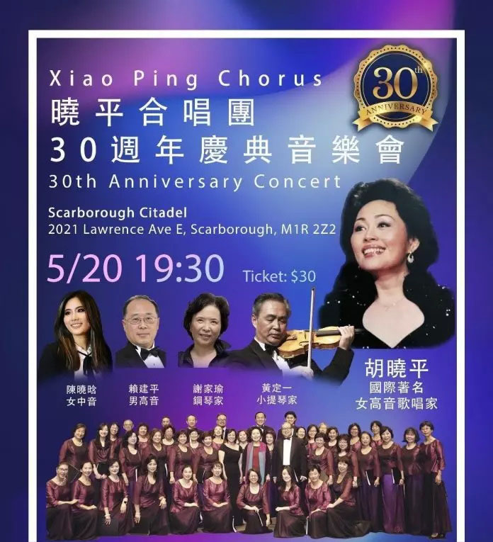 久负盛名的晓平合唱团5月20日举办该团成立30周年庆典音乐会。晓平合唱团是由著名女高音歌唱家胡晓平女士与男中音歌唱家程路禹先生于1992 年创立的以推广和普及中外古典音乐、艺术歌曲为主的音乐团体。胡晓平女士是中国改革开放后第一位在国际重大歌唱比赛中得到大奖的歌唱家。过去的30 年晓平合唱团曾在Roy Thomson Hall,多伦多艺术中心,CBC 演奏厅,湖滨剧院,会议中心及安省科学馆等著名剧院演出。1997年该团参与了北京中央电视台和加拿大CBC 电视台联播的春节联欢晚会。本次音乐会该团演唱了巴洛克时代维瓦尔第的作品《Gloria》、比才的歌剧选段《Habanera》、施特劳斯的《拉德茨基进行曲》,经过时间沉澱仍然很经典的《音乐之声]》套曲,以及脍炙人口的中文歌曲《萱草花》、《往日时光》和保留曲目《雨后彩虹》,胡晓平老师演唱中外名曲《母亲教我的歌》、《星星索》等,女声小合唱组将演唱优美抒情的《La Paloma》和《好人好梦》,两位从美国而来的胡老师学生、声乐博士女中音陈晓晗,男高音赖建平以及小提琴家黄定一,钢琴家谢家瑜联袂打造这次视听盛宴。