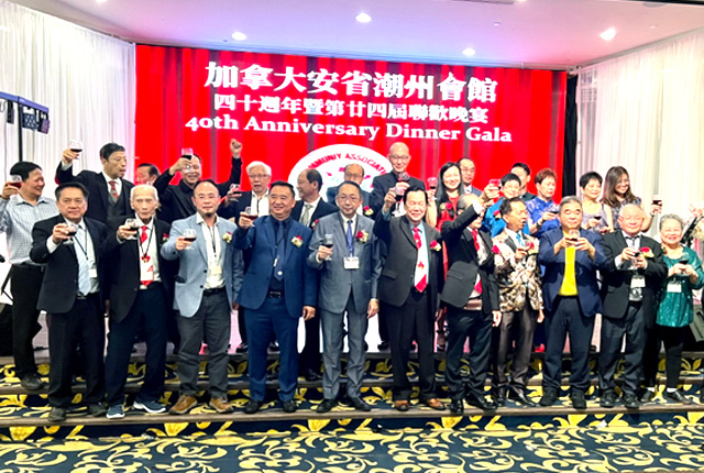 加拿大安省潮州会馆庆祝成立40周年暨第24届理监事就职联欢晚宴会于8月12日晚在“豪门宴”酒楼隆重擧行,包括本地及北美各地的潮州乡亲500余人参加。