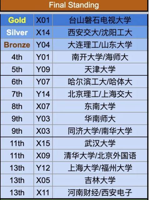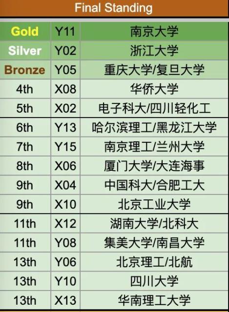在高校B组的比赛中,南京大学获得B组金牌,浙江大学获得B组银牌,重庆大学/复旦大学联队获得B组铜牌。