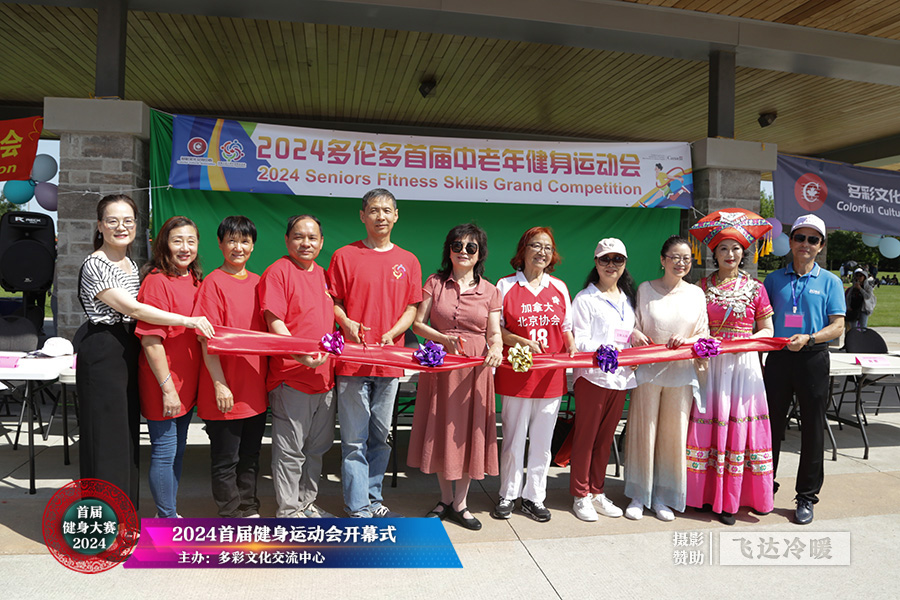 由多彩文化交流中心主办,加拿大华人同乡会联合总会联合主办的《2024多伦多首届中老年健身运动会》开幕式2024年7月20日上午在Berczy Park North公园隆重举行。