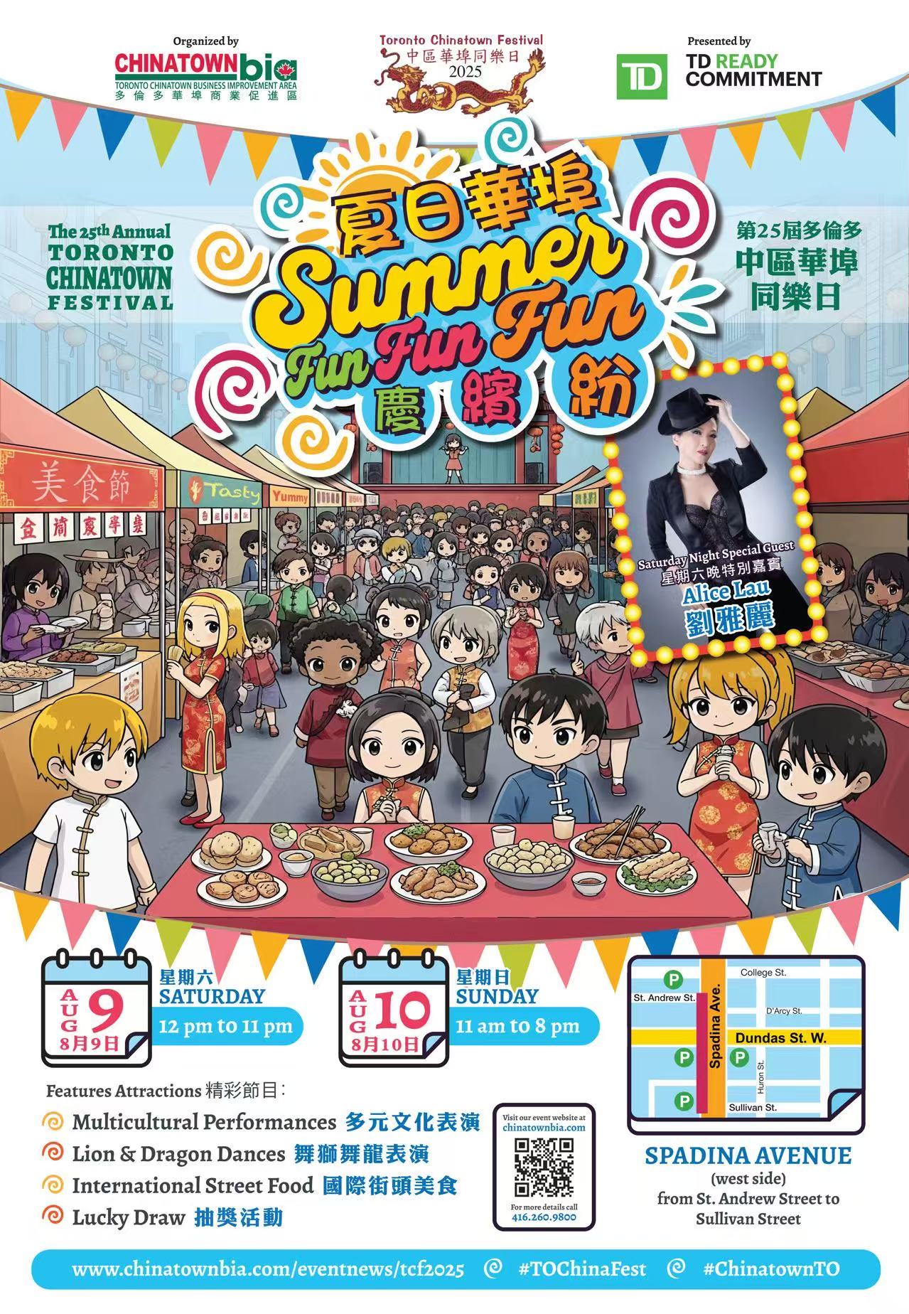 为鼓励朋友们开开心心购买美食,多伦多华埠商业促进区本着促进小区商业繁荣的目标,推出"Dollar for you!"品尝美食计划,合共送出一万元美食票,到场人仕可以领取一元现金票使用,华埠近年商业发展兴旺,除有传统食店外,还有很多潮流食店,为饮食文化带来更精彩一页,为了多和大众分享,以特别优惠价格让大家可以品尝,现场派发饮食优惠体验券,欢迎免费索取。 当大家欣赏精彩表演节目及品尝街头美食之际,新鲜空气,在无唶音环境下,缔造美好吃喝玩乐开心环境,因为多年来大会坚持采用电力供电,让环境更清新。 刘雅丽小姐以一曲"我和春天有个约会"红遍世界各地,为很多人带来美好回忆,大家有福了可以在8月9日晩上欣赏, 除此之外还有多精彩节目,包括由赖德梧指挥亲自指挥加拿大小交响青少年乐团,乐团刚好到意大利,维也纳演出返回多伦多,舞狮表演非常精彩,紧张刺激,光辉龙狮体育会表演国际高度标准梅花桩及4米高杆彩菁, 喷火变脸…街头派对"Sound One"乐队及"King & Queen "乐队及越南剧. 大家来到华埠唐人街,记得来喝一杯由Tim Horton 赞助的免费咖啡。